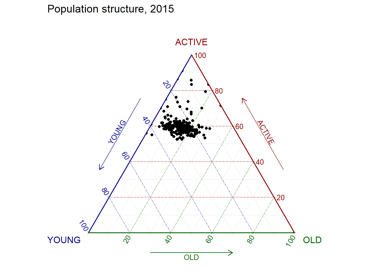 ggtern(data=agpop_mutated,aes(x=YOUNG,y=ACTIVE, z=OLD)) +