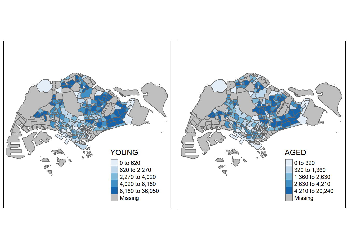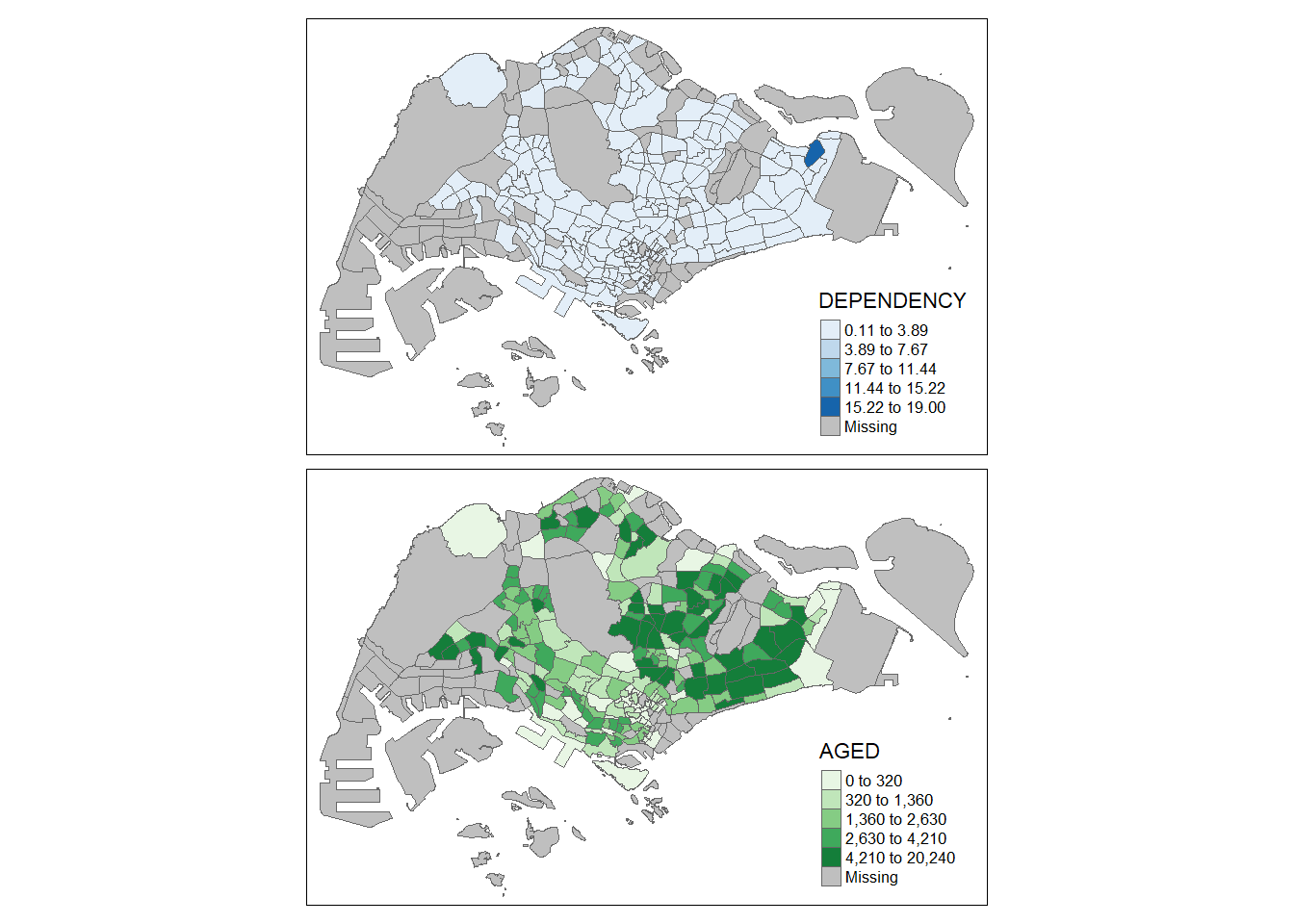 Choropleth mapping involves the symbolisation of enumeration units, such as countries, provinces, states, counties or census units, using area patterns or graduated colors. For example, a social scientist may need to use a choropleth map to portray the spatial distribution of aged population of Singapore by Master Plan 2014 Subzone Boundary.