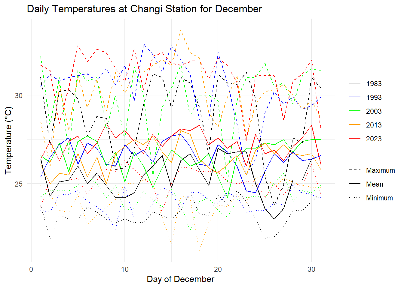 labs(title = 'Daily Temperatures at Changi Station for December', x = 'Day of December', y = 'Temperature (°C)', color = "Year", linetype = "Temperature Type") +